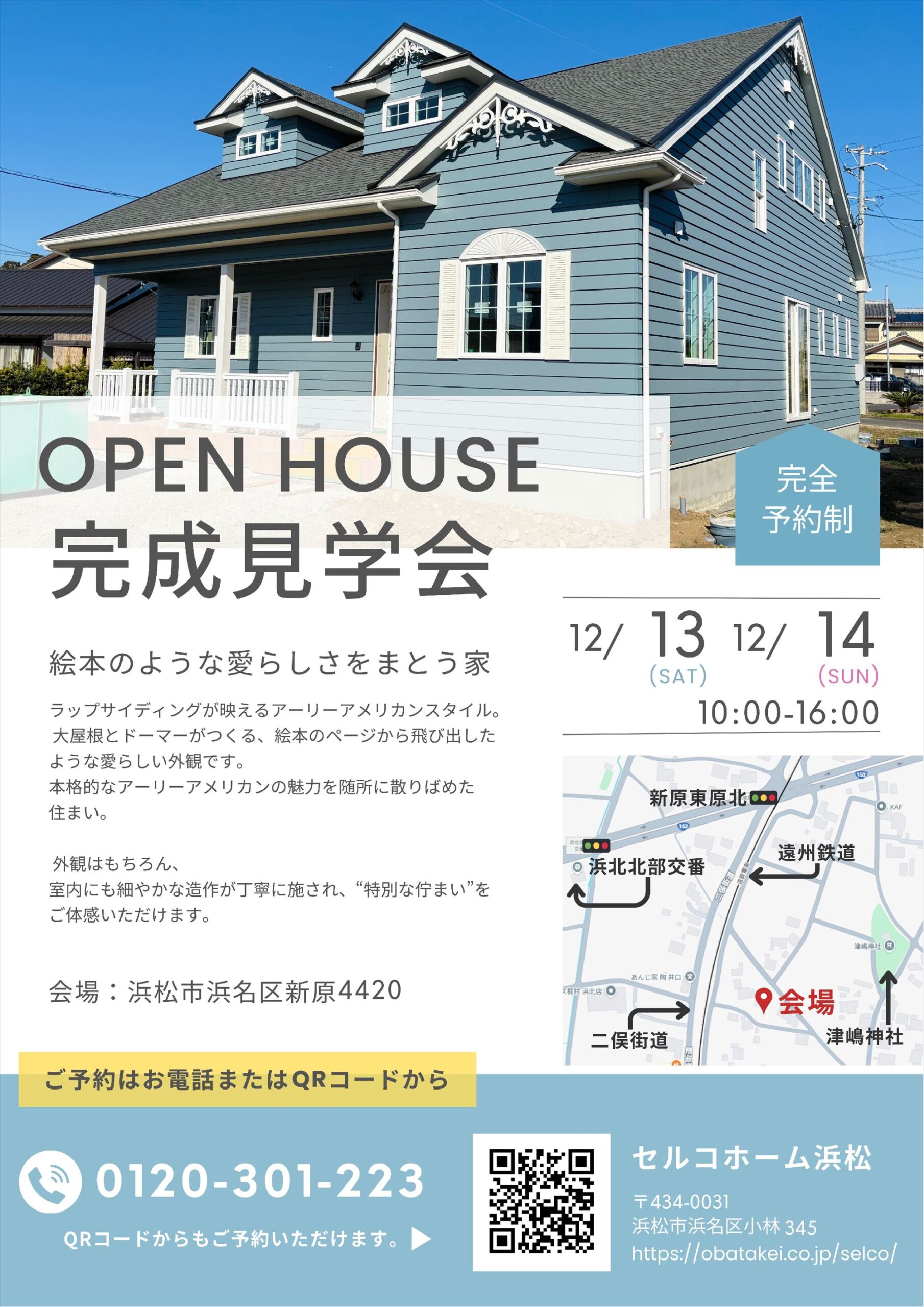OPEN HOUSE完成見学会開催! 浜松市浜名区新原12/13(土)・14(日)・・10:00~16:00 完成見学会 2025.12.07 詳しくはこちらまでお問い合わせください:セルコホーム浜松 ( 0120-301-223)
